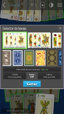 Prepárate para una inmersión visual con cartas en alta definición y una selección variada de barajas españolas, personalizables incluso en su tamaño. Los reversos de alta definición y las fluidas animaciones dan vida a cada jugada, mientras que una interfaz sencilla y minimalista garantiza que tu atención se centre únicamente en el juego. Ya sea que prefieras el desafío de la inteligencia artificial con diversos niveles de dificultad o la flexibilidad de jugar en orientación vertical u horizontal, Chinchón se adapta a ti. Y para los puristas, las reglas de Chinchón son completamente configurables, ofreciendo una experiencia auténtica y a tu medida. Mantente atento, ya que el modo online para jugar con amigos se integrará próximamente, expandiendo aún más tus opciones de diversión.