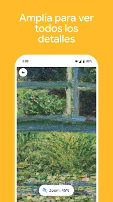Google Arts & Culture va más allá de la interacción lúdica, invitándote a una exploración profunda. Recorre lugares históricos emblemáticos a través de Street View, viaja en el tiempo y por el arcoíris del arte explorando por época y color. Incluso en modo sin conexión, el Reconocedor de Arte te brinda información detallada al apuntar tu cámara a una obra en museos seleccionados. Organiza tus piezas favoritas en galerías personalizadas, descubre exposiciones curadas por expertos, y recibe notificaciones semanales para mantenerte al día. Con la función de traducción, el mundo del arte internacional se vuelve accesible en tu propio idioma, y la opción "Cercano" te conecta con museos y eventos culturales a tu alrededor, enriqueciendo cada momento de tu viaje cultural.
