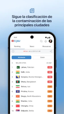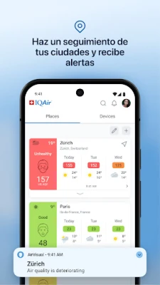 Además, recibe recomendaciones sanitarias personalizadas para minimizar tu exposición a contaminantes, crucial para grupos sensibles. Mantente al tanto de los recuentos de polen con previsiones a tres días y gestiona eficazmente tus alergias. La aplicación también te informa sobre incendios forestales y otros eventos que afectan la calidad del aire globalmente, ofreciendo una vista integral que incluye datos meteorológicos, alertas y noticias actualizadas. Para una experiencia conectada, sincroniza tus monitores IQAir AirVisual Pro y Outdoor, o controla remotamente tus purificadores de aire compatibles para un ambiente interior óptimo.
