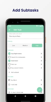 Nunca más olvides un compromiso gracias al intuitivo sistema de ToDodo. Configura recordatorios puntuales y eventos recurrentes para automatizar tu gestión. Opta por alarmas emergentes que se repiten, asegurando que ninguna tarea crítica pase desapercibida. Mantén una perspectiva completa de tu progreso con diversas vistas panorámicas: revisa tus pendientes de 'Hoy', explora lo 'Próximo' o enfócate en lo 'Priorizado'. El práctico calendario te ofrece una visión global, y los widgets personalizables para tu pantalla de inicio garantizan que tus listas más importantes estén siempre visibles.